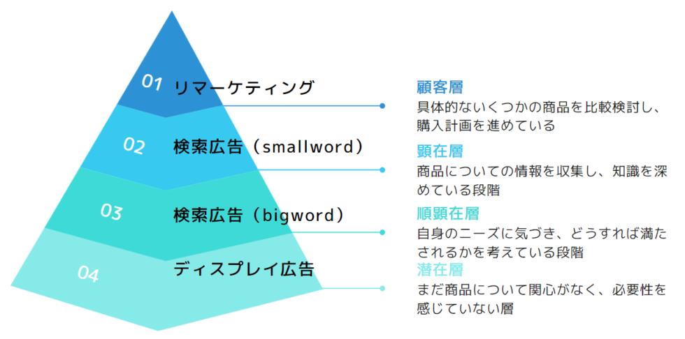 検索連動型広告はキーワードをベースにユーザーにアプローチするので、悩みや課題が明確になって検索をしている「顕在層」に効果的です。