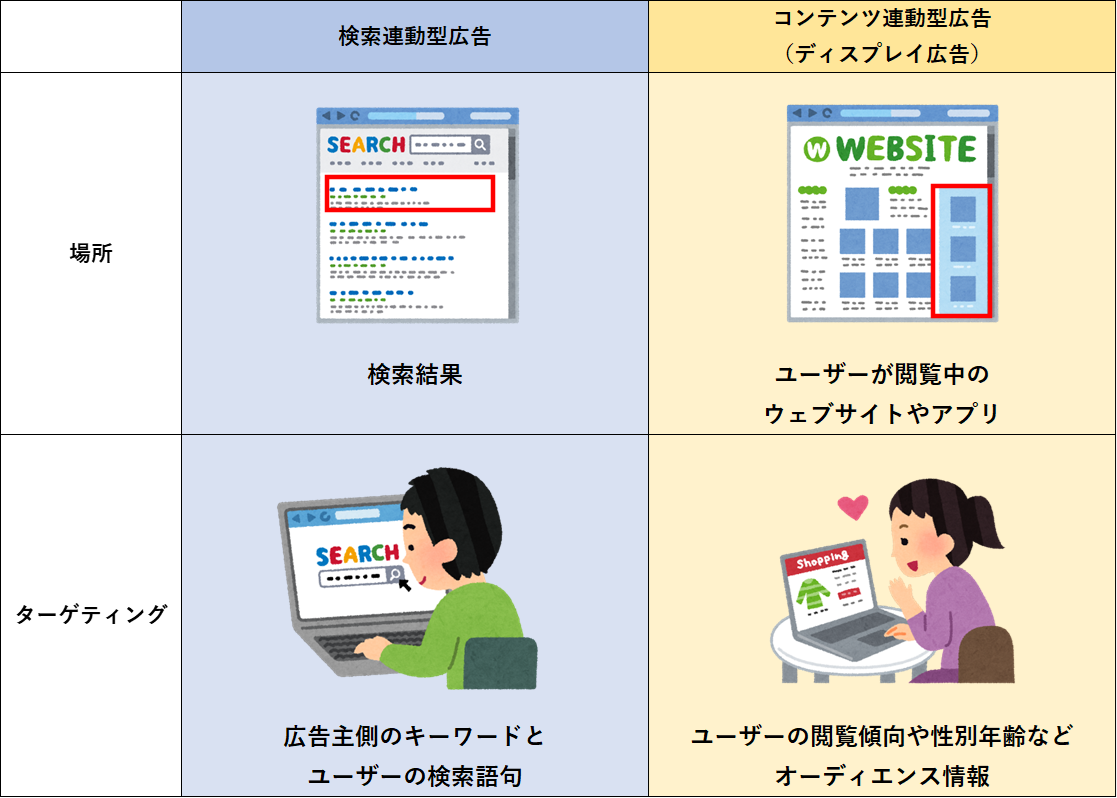 検索連動型広告はサイトを検索した際の検索結果に表示されるのに対して、ディスプレイ広告はWebページやアプリ面上のどこかに表示されます。