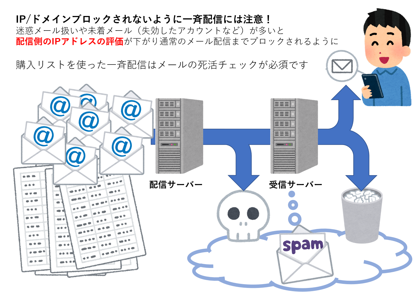 存在しないメールアドレスにメルマガ配信を続けていると、宛先のサーバーがそのメルマガをスパム判定してしまうリスクがあります。