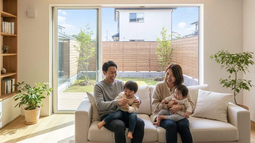 リビングでくつろぐ家族の笑顔