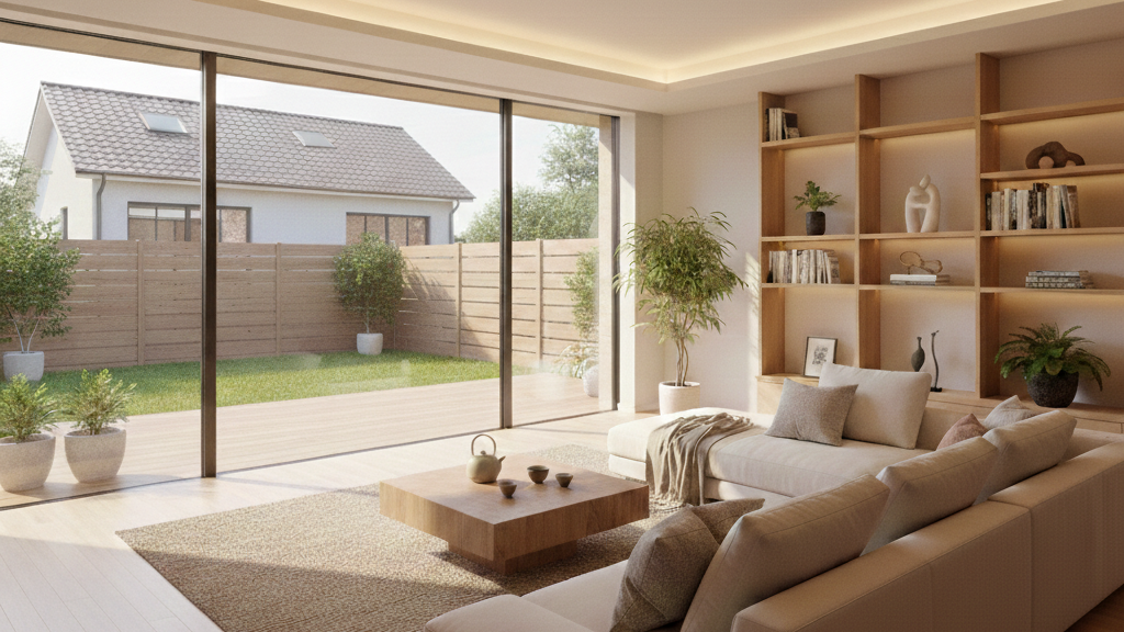 「朝日が差し込む、開放的なリビング」