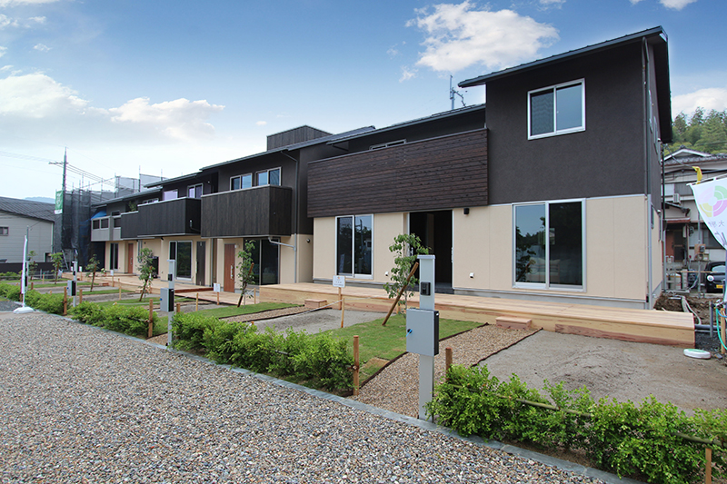 具体的には、京都府内産木材を使用した素朴でシンプルな一戸建て6戸で構成される統一感のある街並みに、敷地全体を共有スペースと専用スペースに分ける等の区画整理で機能性を持たせ、居住者が共同で維持・管理する「住宅型の共同住宅的街造り」という従来型の分譲区画とは一線を画した特徴的なランドプランで付加価値を生み出しています。