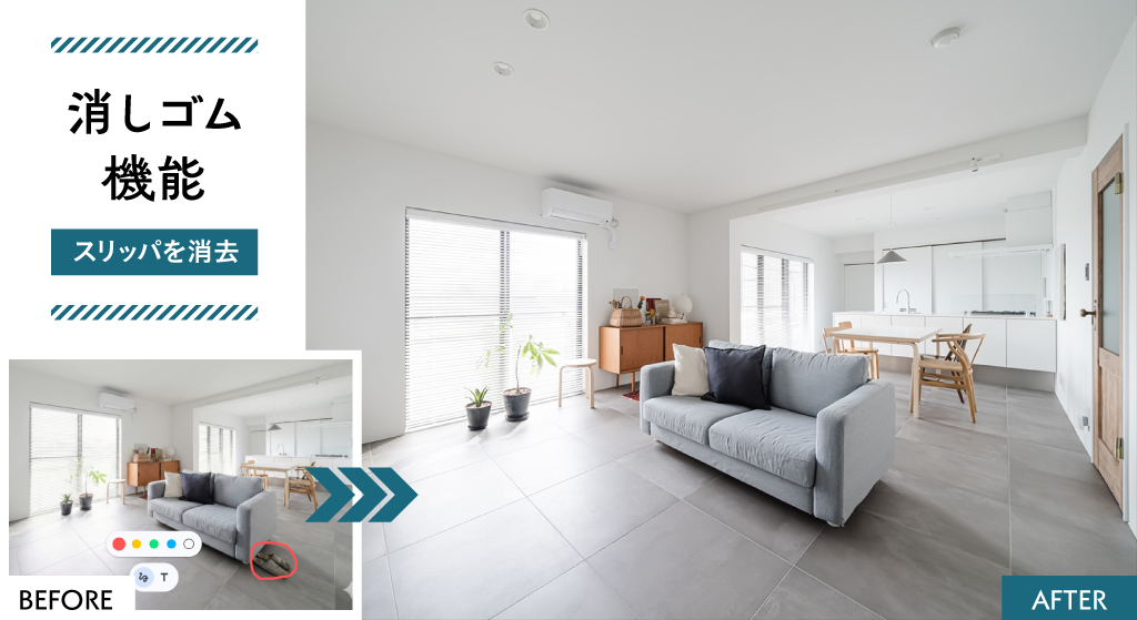 まずはご自身でトライ。「消しゴム」でのノイズ除去や簡単な「家具配置」を行うだけでも、写真の見栄えは劇的に良くなります。
