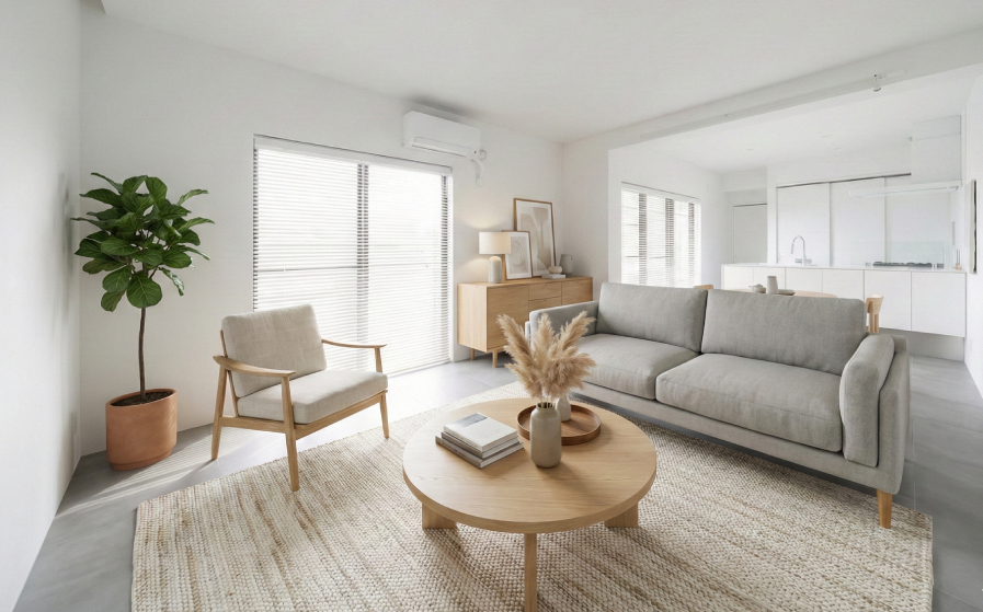 傷は画像処理で「消す」のではなく、家具の配置やラグで「自然に視線を逸らす」のが、デザイナーの腕の見せ所です。