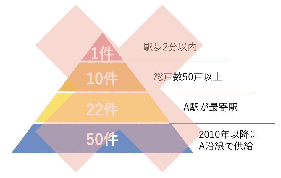 例えば、「A市内(条件1)」「過去2年(条件2)」「駅徒歩2分以内(条件3)」といった複数の条件を重ねていき、その結果として「該当するのは当社のみ」という結論に導く手法です。