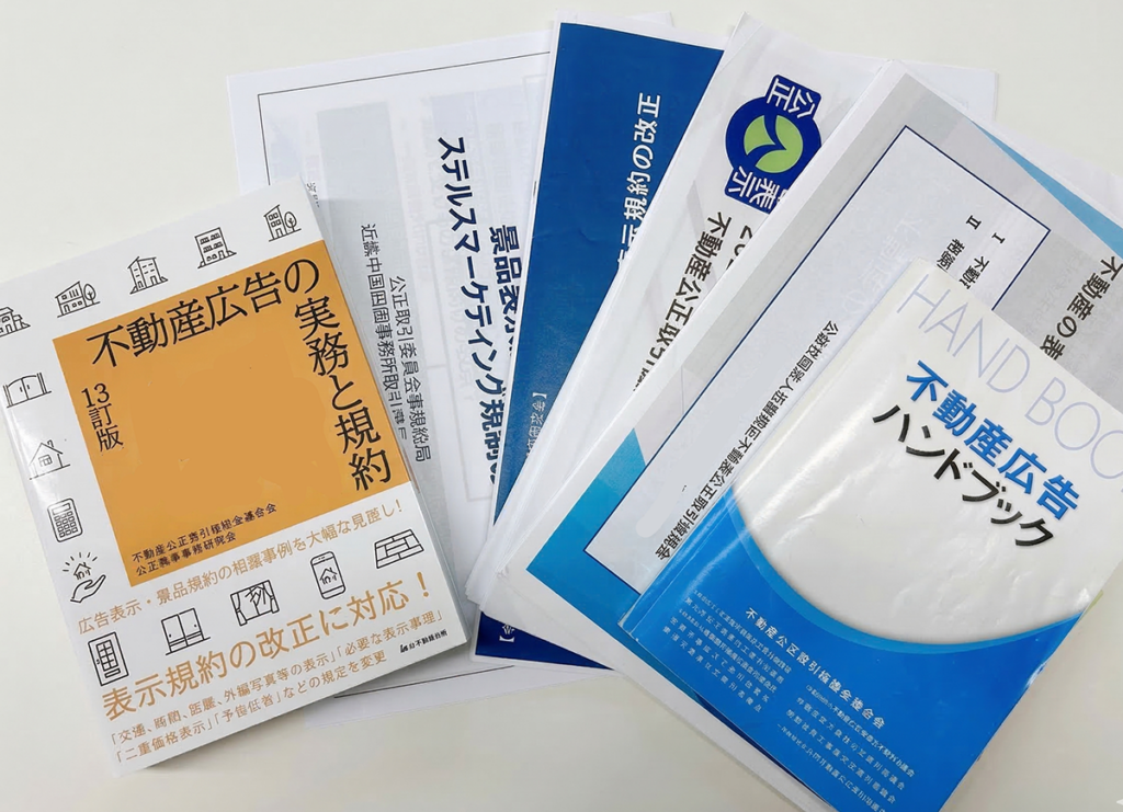 私たちアド・コミュニケーションズは、不動産公正取引協議会の賛助会員として、常に最新の表示規約を遵守し、適正な広告運用の普及に努めています(上記写真の本や資料は実際に社内に置いてあるものの一部です)。